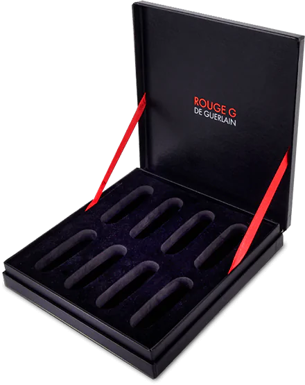 • Black higed rigid presentation box with red ribbon stop and eva insert that says guerlain